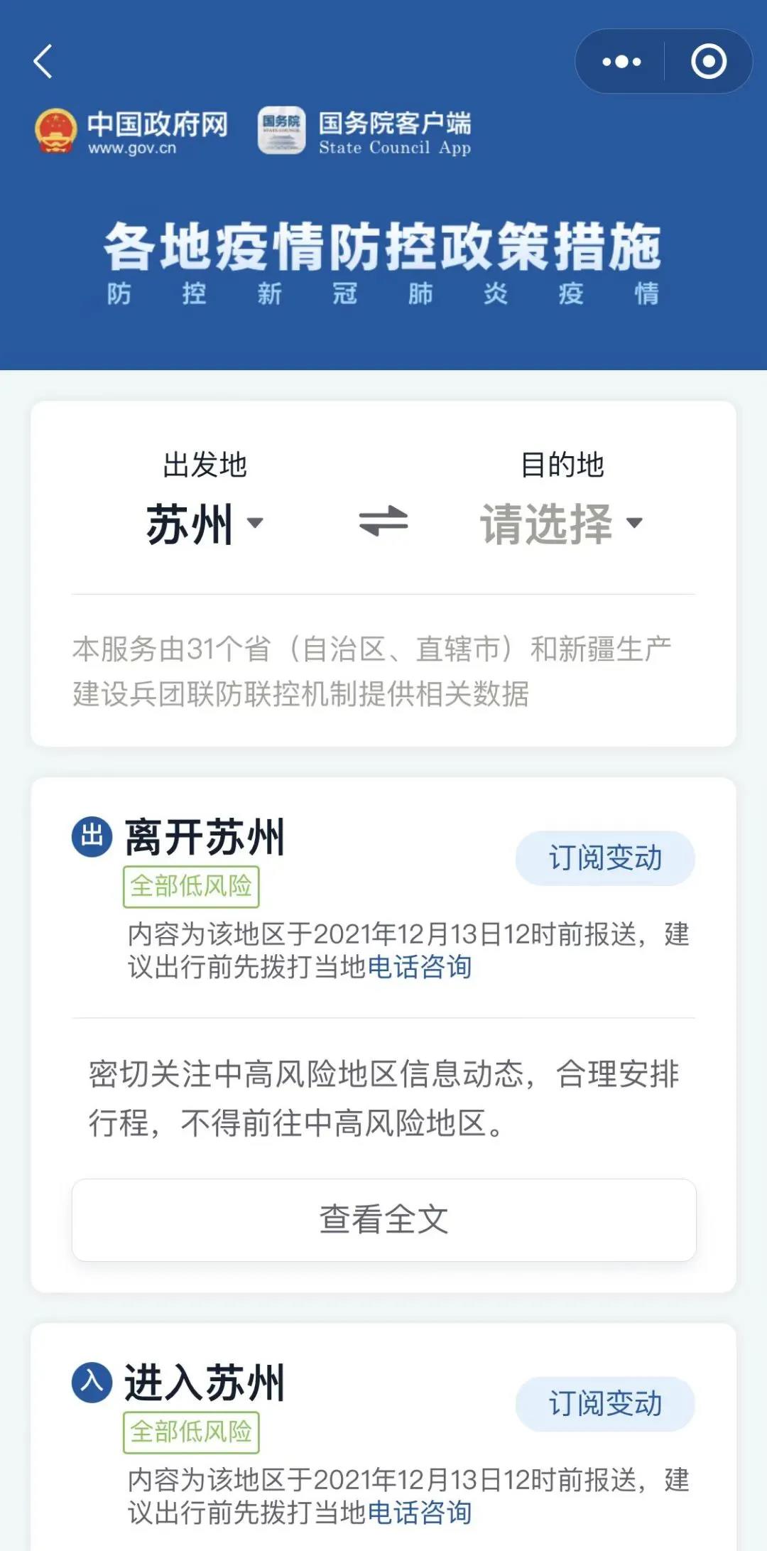 最近要出門,不知道出發(fā)地、目的地都有什么疫情防控政策措施?別著急,兩步教你查詢!“張家港發(fā)布”微信菜單欄打開“國(guó)務(wù)院客戶端”小程序,進(jìn)入后搜索“各地疫情防控政策措施”,即可搜索查詢相關(guān)信息!