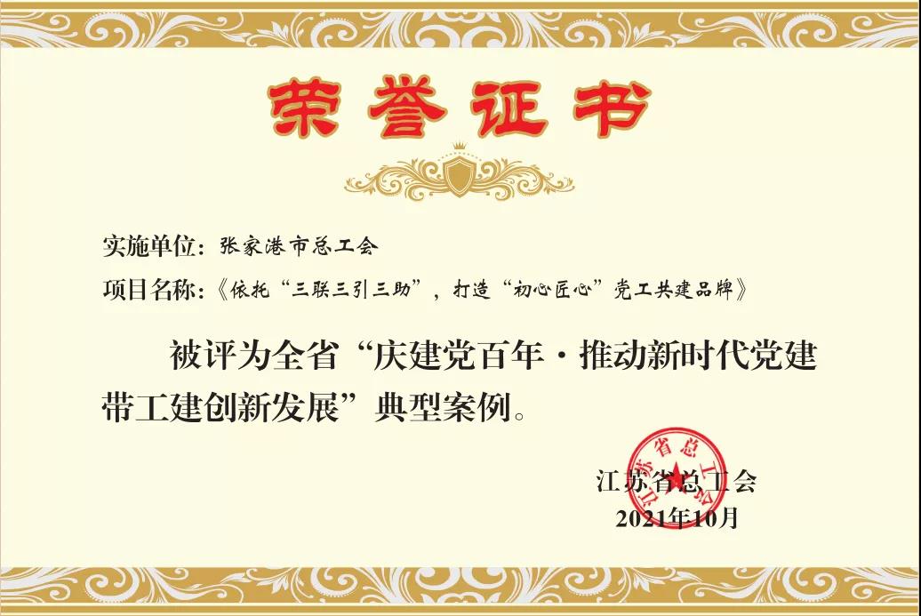 日前,“慶建黨百年·推動新時代黨建帶工建創(chuàng)新發(fā)展”優(yōu)秀成果發(fā)布,我市總工會“依托‘三聯(lián)三引三助’打造‘初心匠心’黨工共建品牌”被評為江蘇省典型案例。